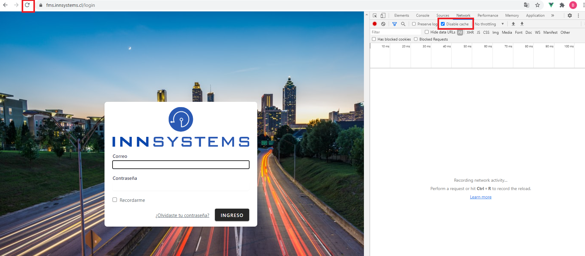 Finalmente dirigirse a la pestaña "Network" y fijarse que la opción "Disable Cache" este activa. Luego de eso presionar recargar. Una vez recargada puedes cerrar el modo desarrollador o presionar nuevamente F12.